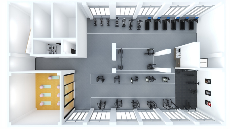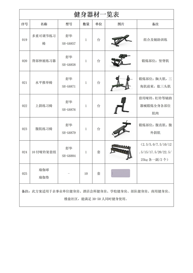 此方案要求面积小于420平米,此方案适用于企事业单位健身房、酒店会所健身房、学校健身房、部队健身房、商用健身房、楼盘社区,能满足30-50人同时健身使用。