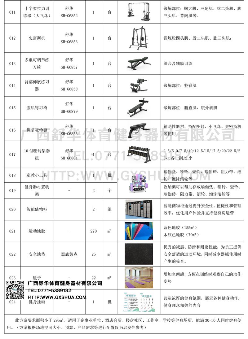 此方案要求面积小于295m²,适用于企事业单位、酒店会所、楼盘社区、工作室、学校等健身场所,能满30-50人同时健身使用。(方案根据场地空间大小、预算、产品需求等进行配置仅为启发性参考)