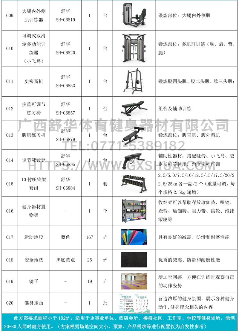 此方案要求面积小于192m²,适用于企事业单位、酒店会所、楼盘社区、工作室、学校等健身场所,能满20-30人同时健身使用。(方案根据场地空间大小、预算、产品需求等进行配置仅为启发性参考)